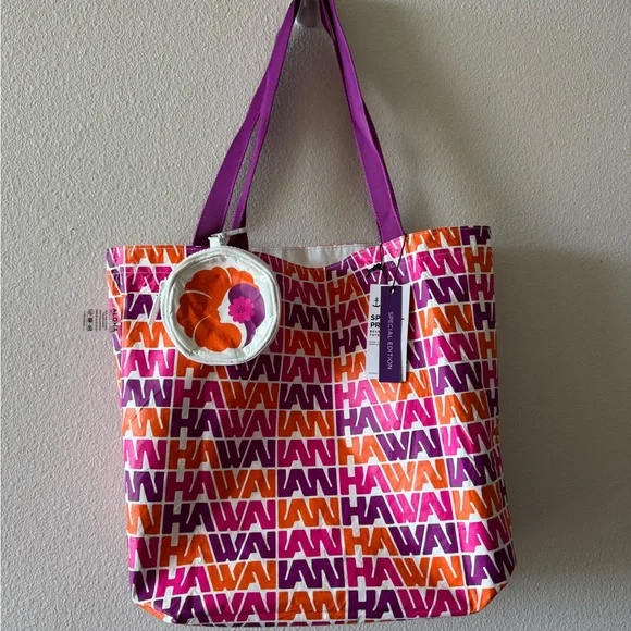 Aloha Collection x Hawaiian Airlines Tote & CutieBrand new, never used, in original packagingSOLD OUT IN STORES & ONLINEReversible tote & Cutie Vintage Pualani Reversible Tote Open Top DesignReversible17" W x 13" H1" wide nylon straps10.5” strap drop lengthReverses to vintage hawaiian printVintage Cutie 6" zipper opening at topStructured pipingMetal swivel hook looped on top of bag4" diameter13.5" Circumference0.5" gusset